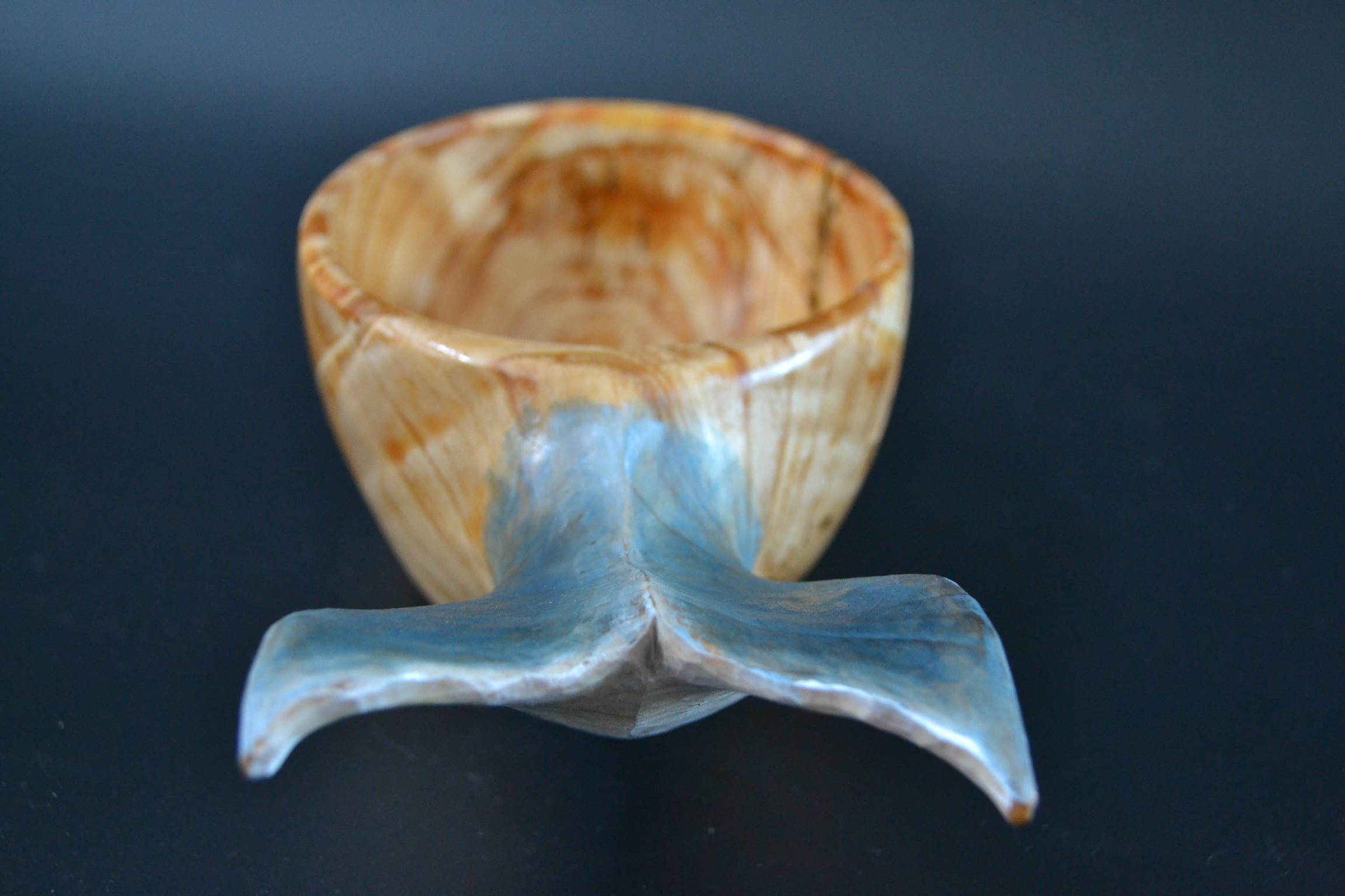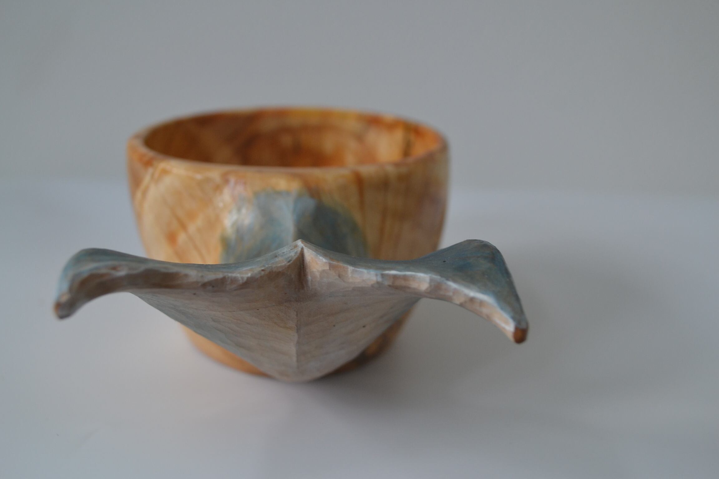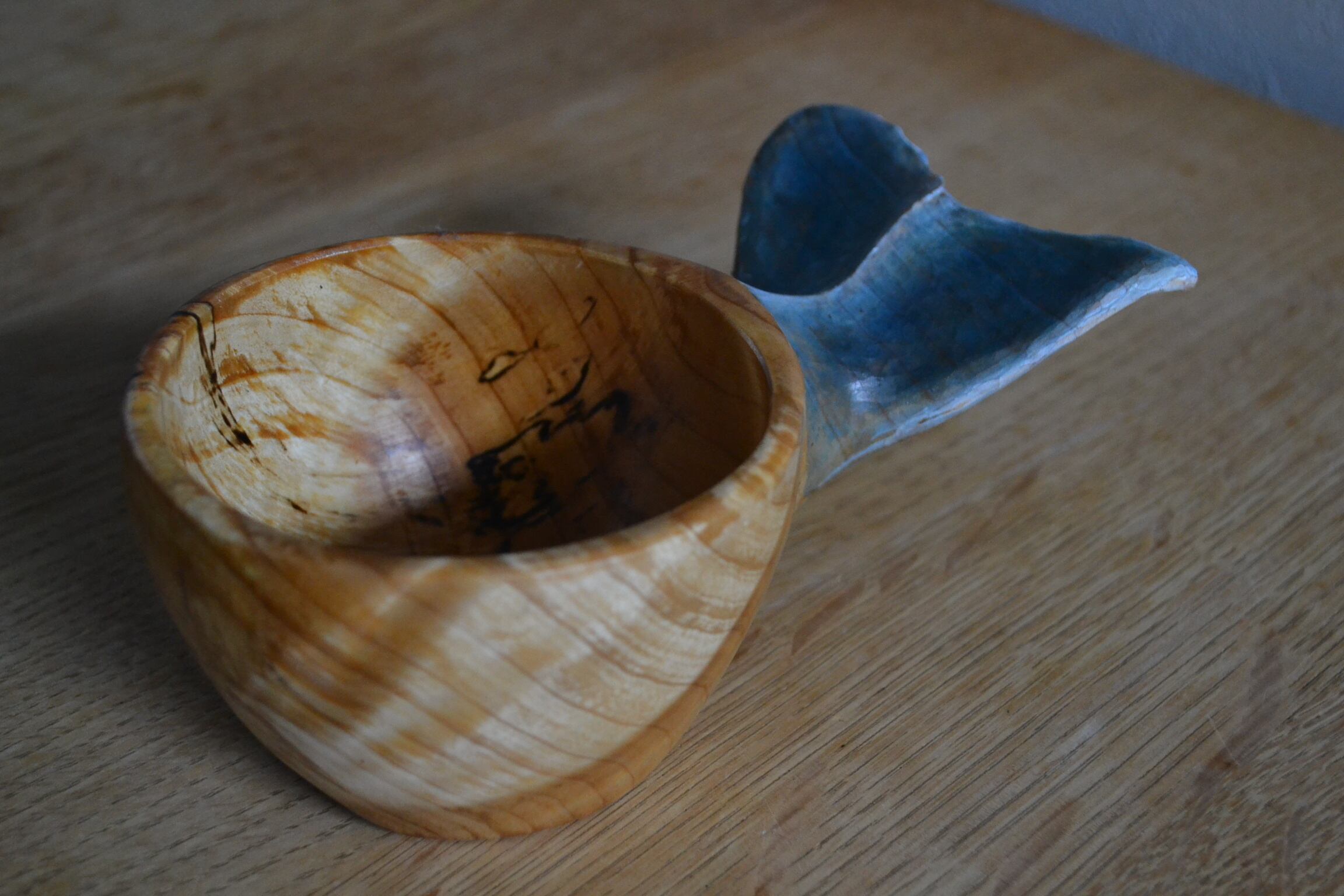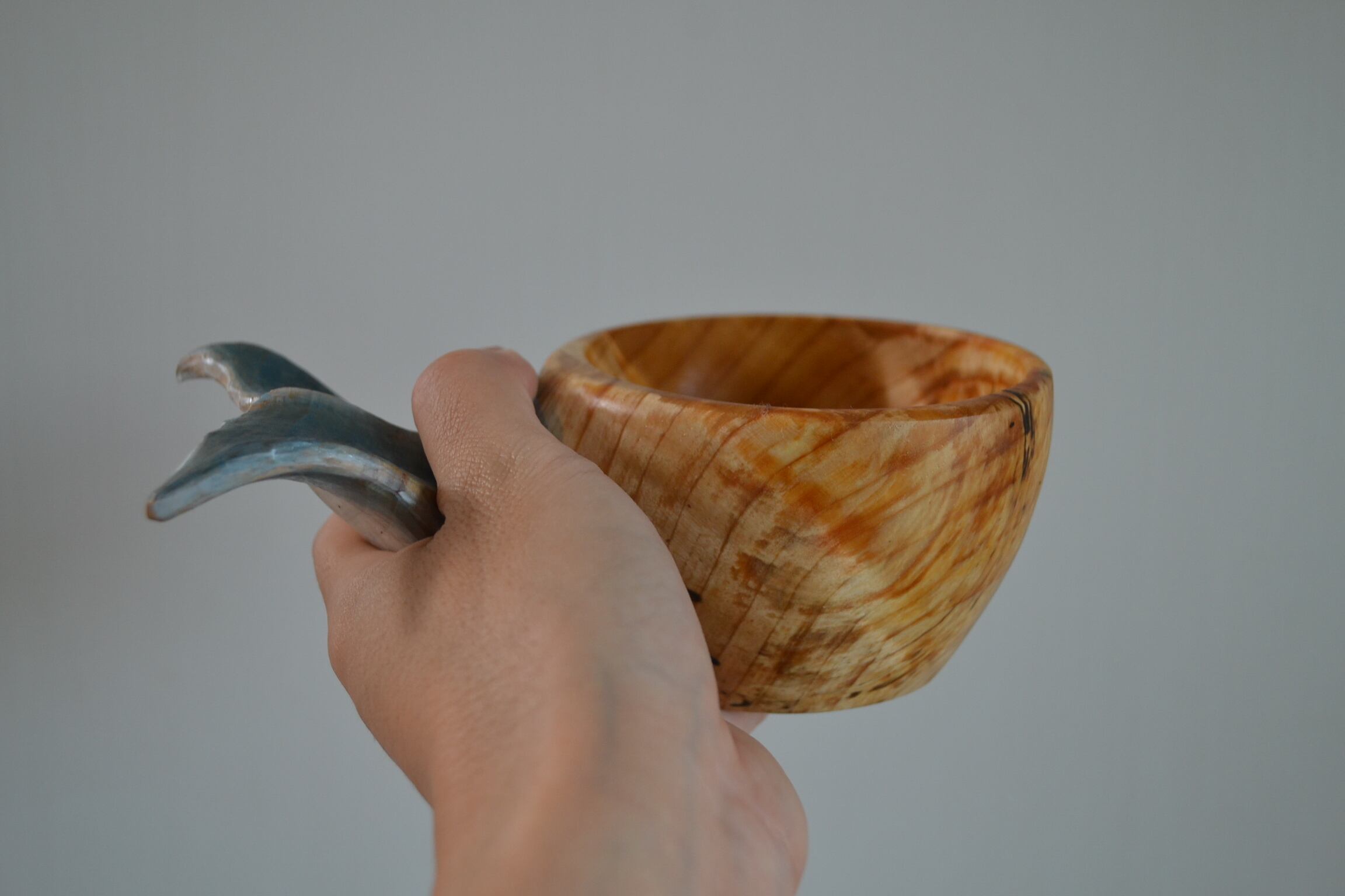 持ち手に美しい尾びれの木彫りが施されており、動物ククサの中では唯一持ち手に穴がない、