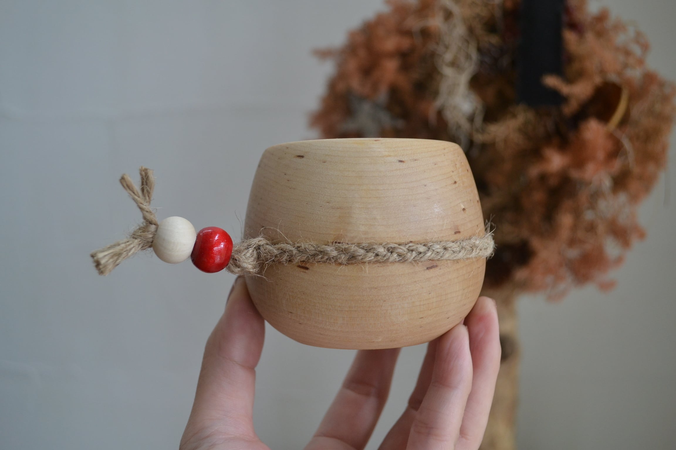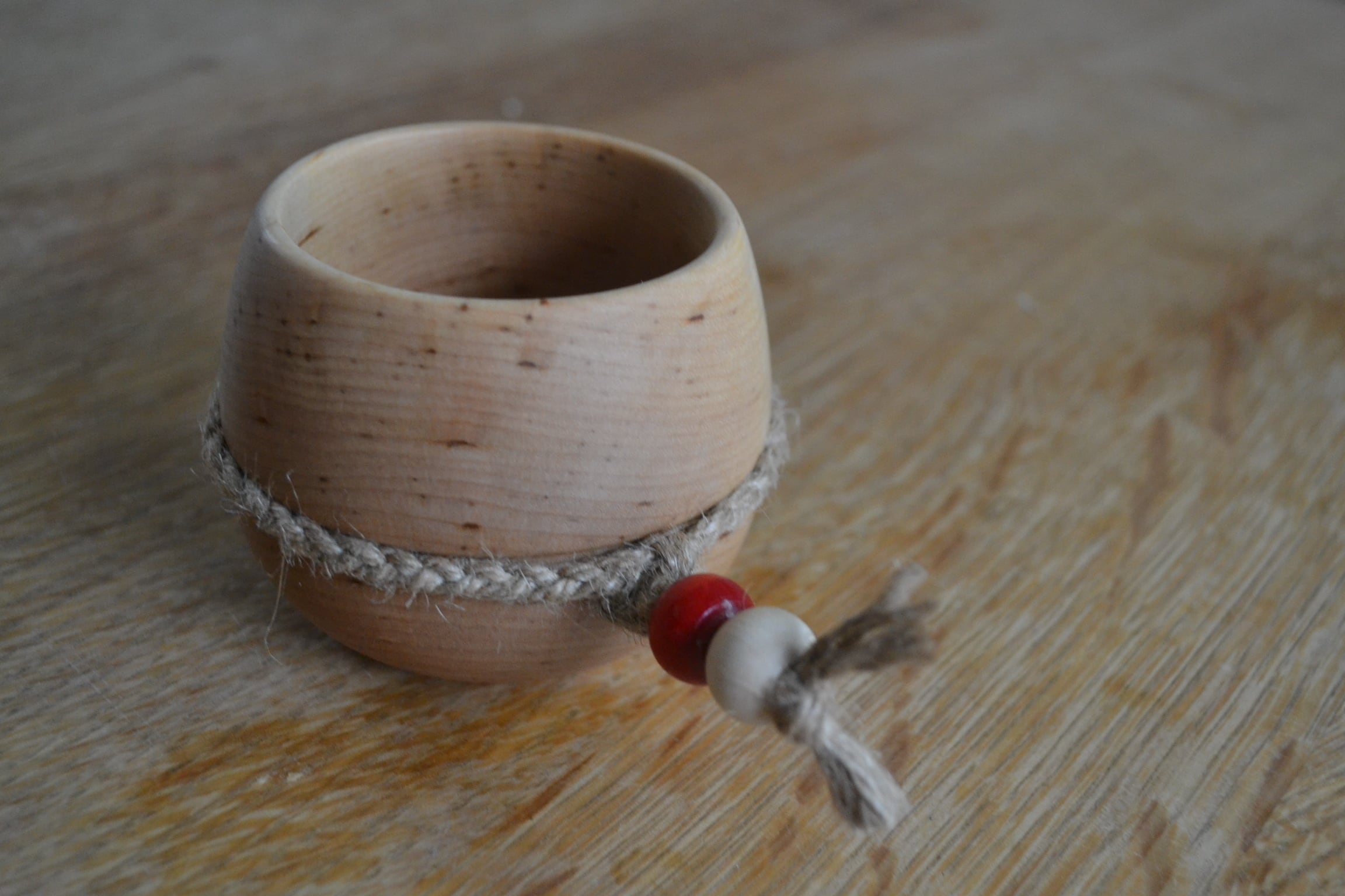 ククサの制作は北海道に住むククサ職人GWTさんに依頼し、巻いてあるストラップ(麻紐+ビーズ)は店主が心を込めて手作りしました。サーミストラップへの付替えも可能です(別売)