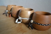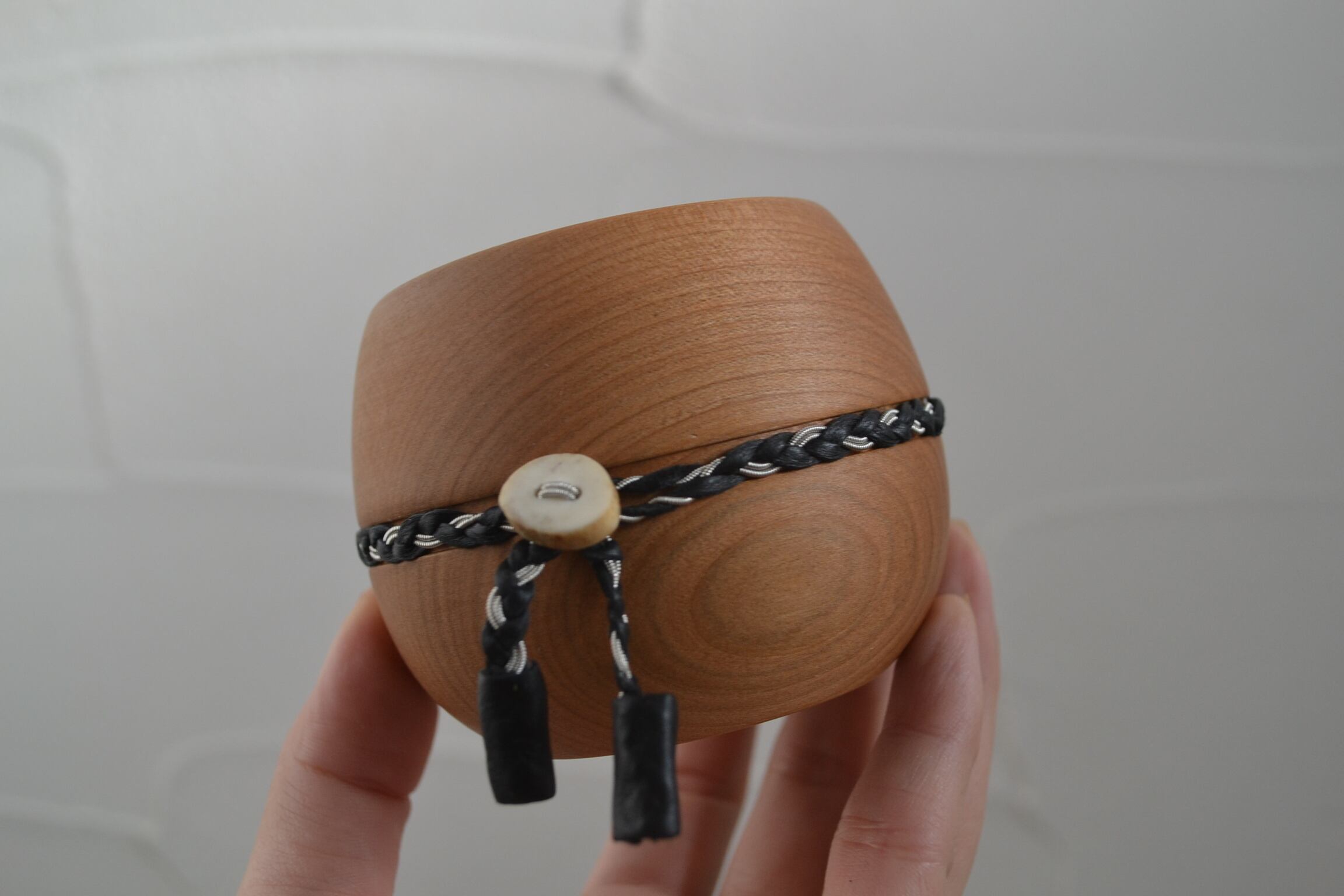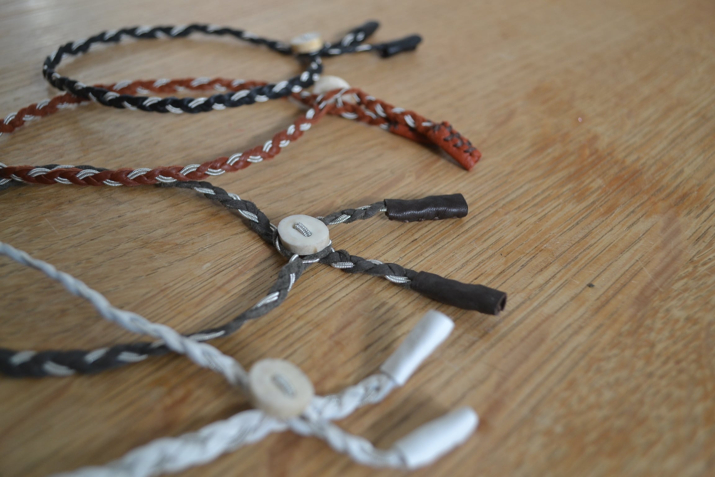 スウェーデンからお取寄したトナカイの革とピューターワイヤー、角ボタンから作りました。