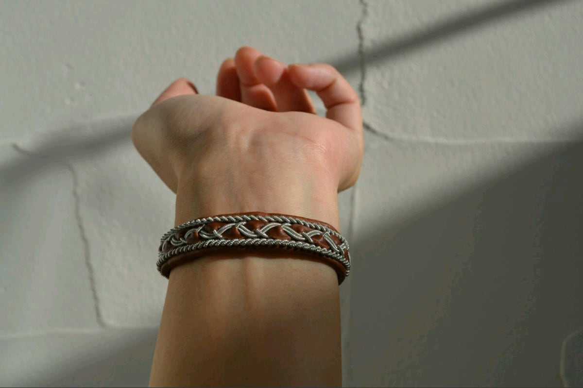 トナカイレザーの上に繊細に編み込まれたワイヤー模様が、シンプルながらしっかりとした存在感を生み出しています。コチラはピューターワイヤーと革を一緒に編み込んだ人気のデザインとなります。
