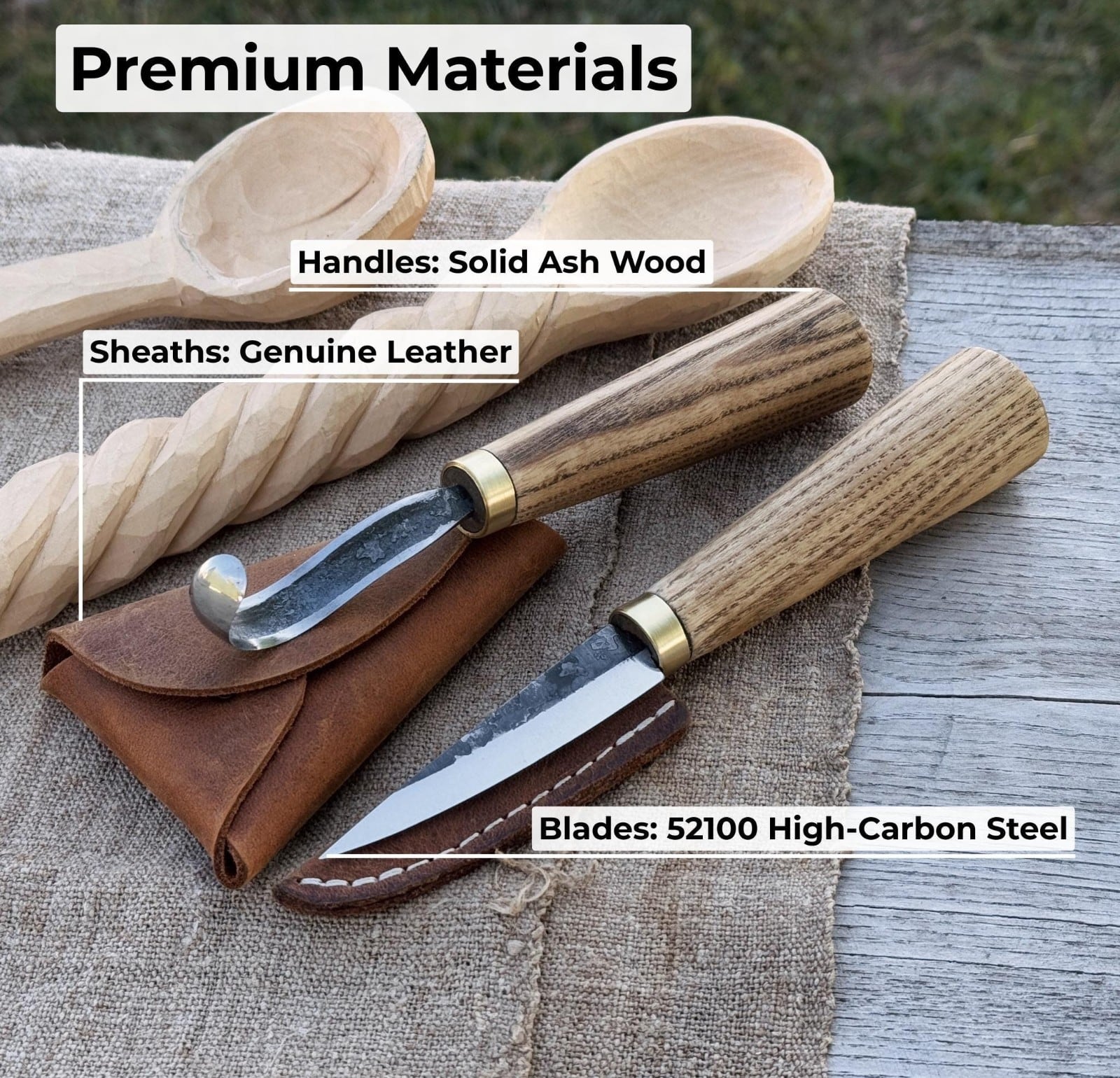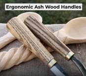 ・ハンドル: 天然のアッシュ材で作られた各ハンドルは、人間工学に基づいて形作られており、快適なグリップを実現し、天然オイルで処理されているため、滑らかで耐久性のある仕上がりになっています。