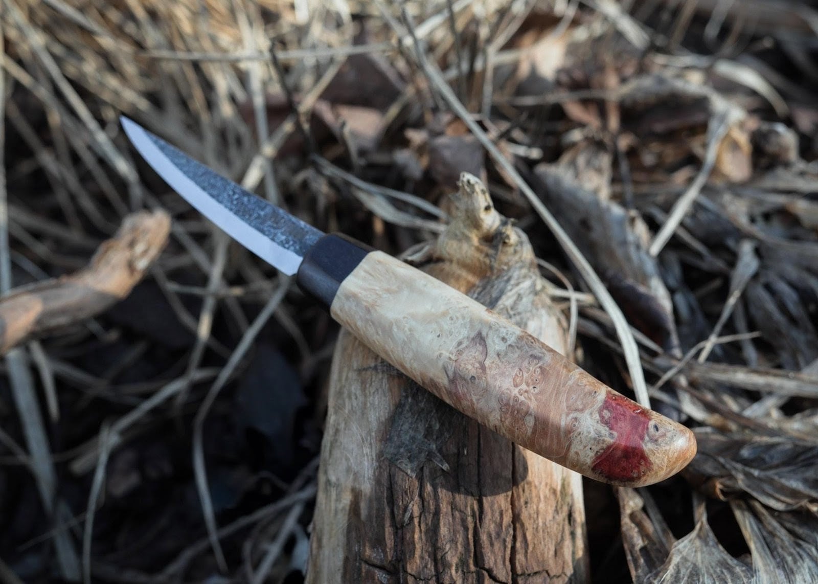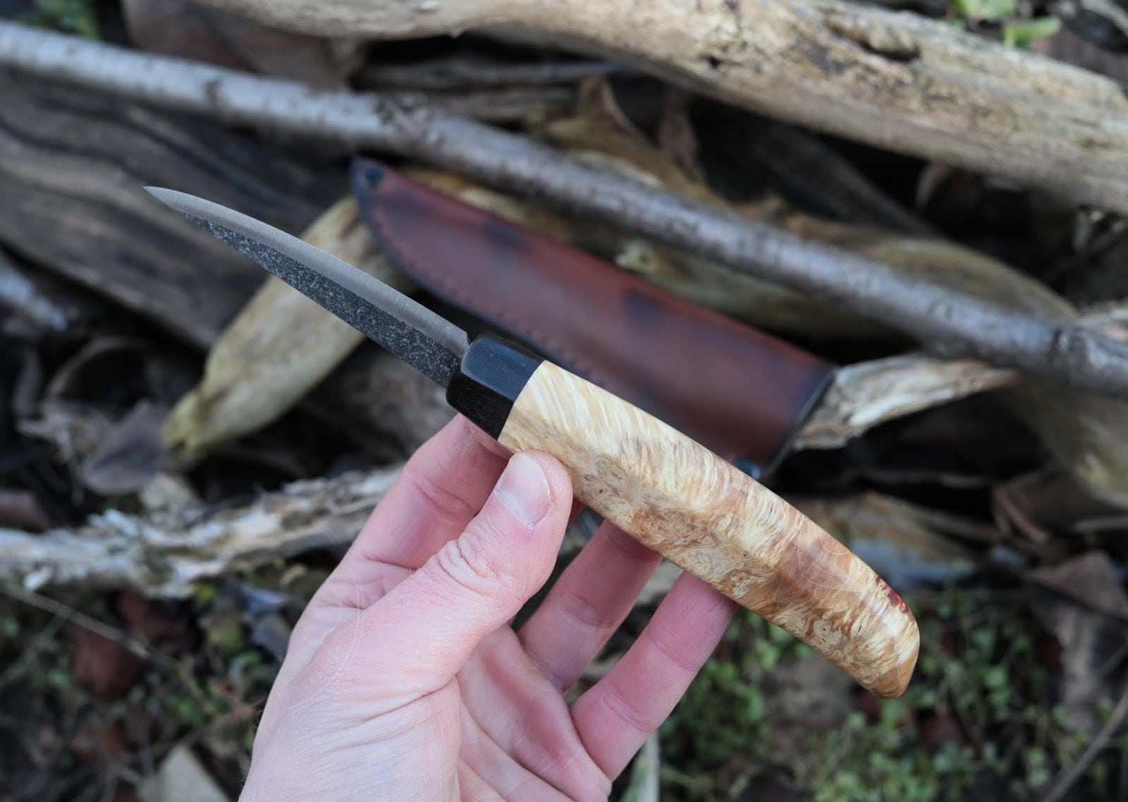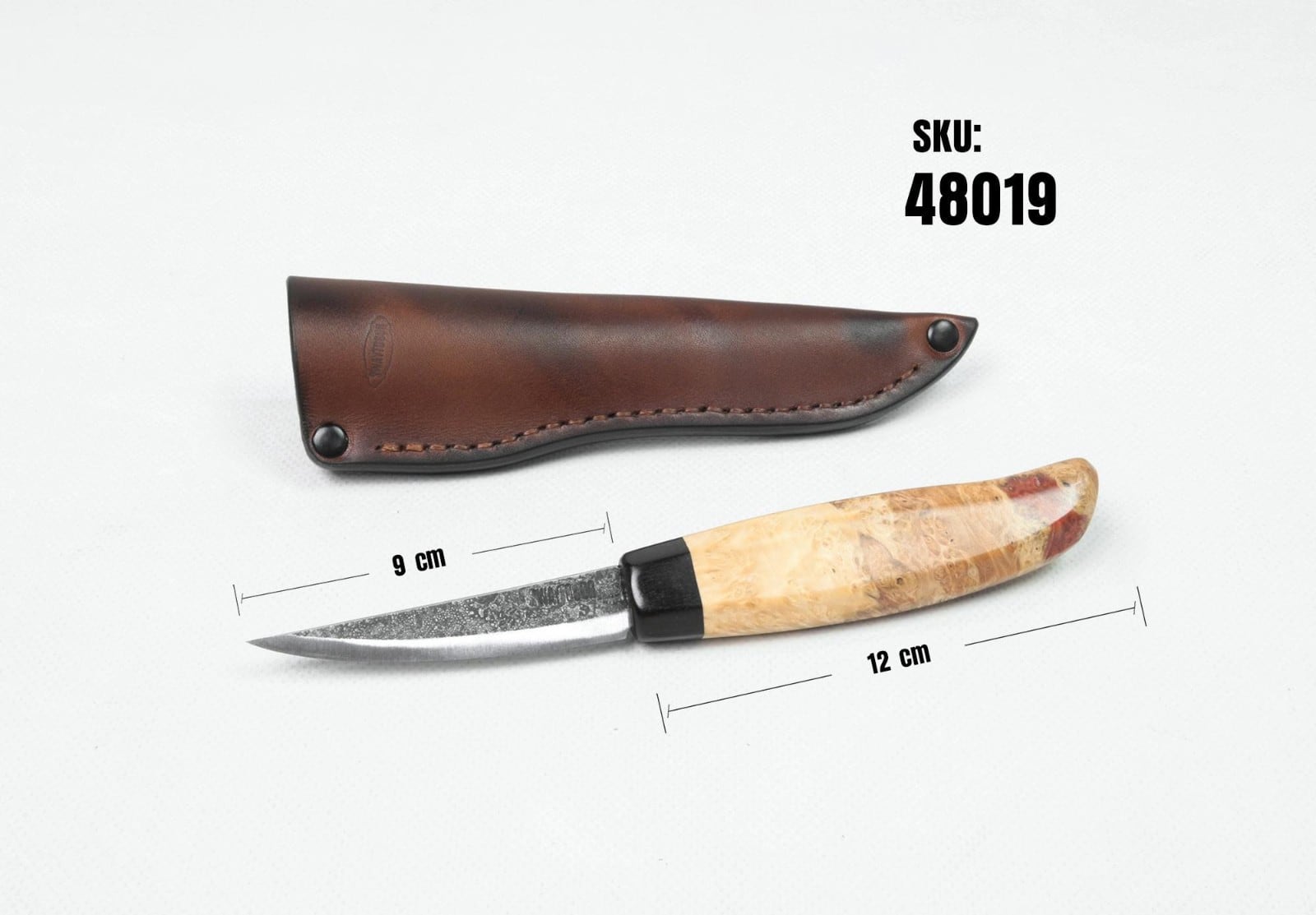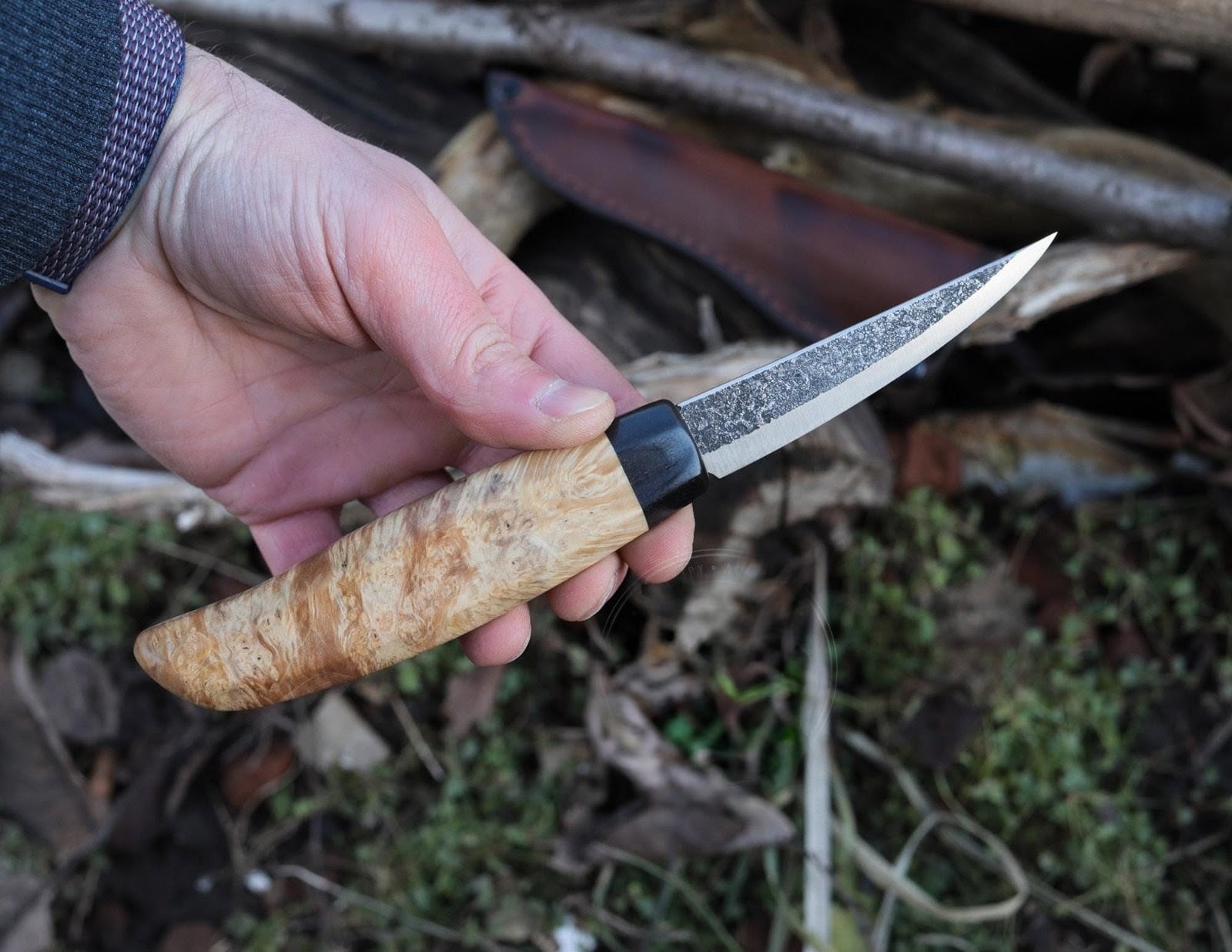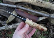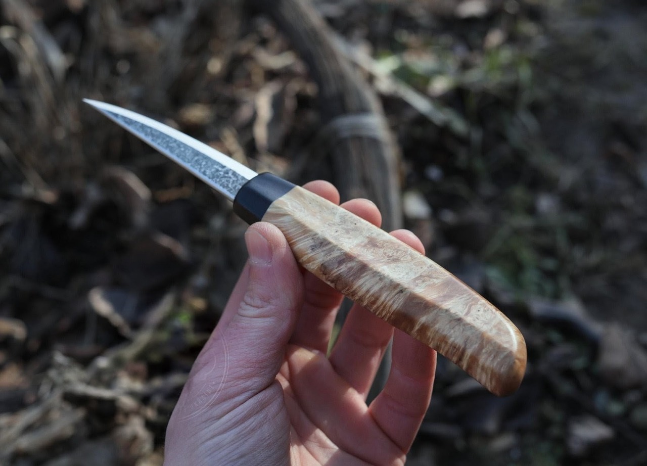 コチラは快適で安全なグリップを実現する美しいメープルの瘤ハンドルを備えた、鋭い切れ味の手鍛造カービングナイフです。