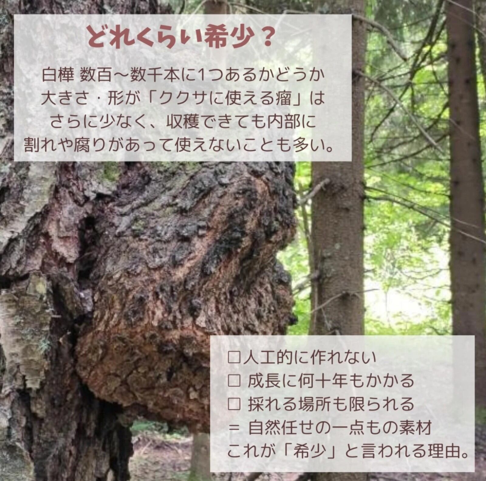 白樺の瘤は、数百本に一本とも言われるほど稀にしか現れない自然の奇跡。その複雑で美しい杢目は同じものが二度と生まれません。