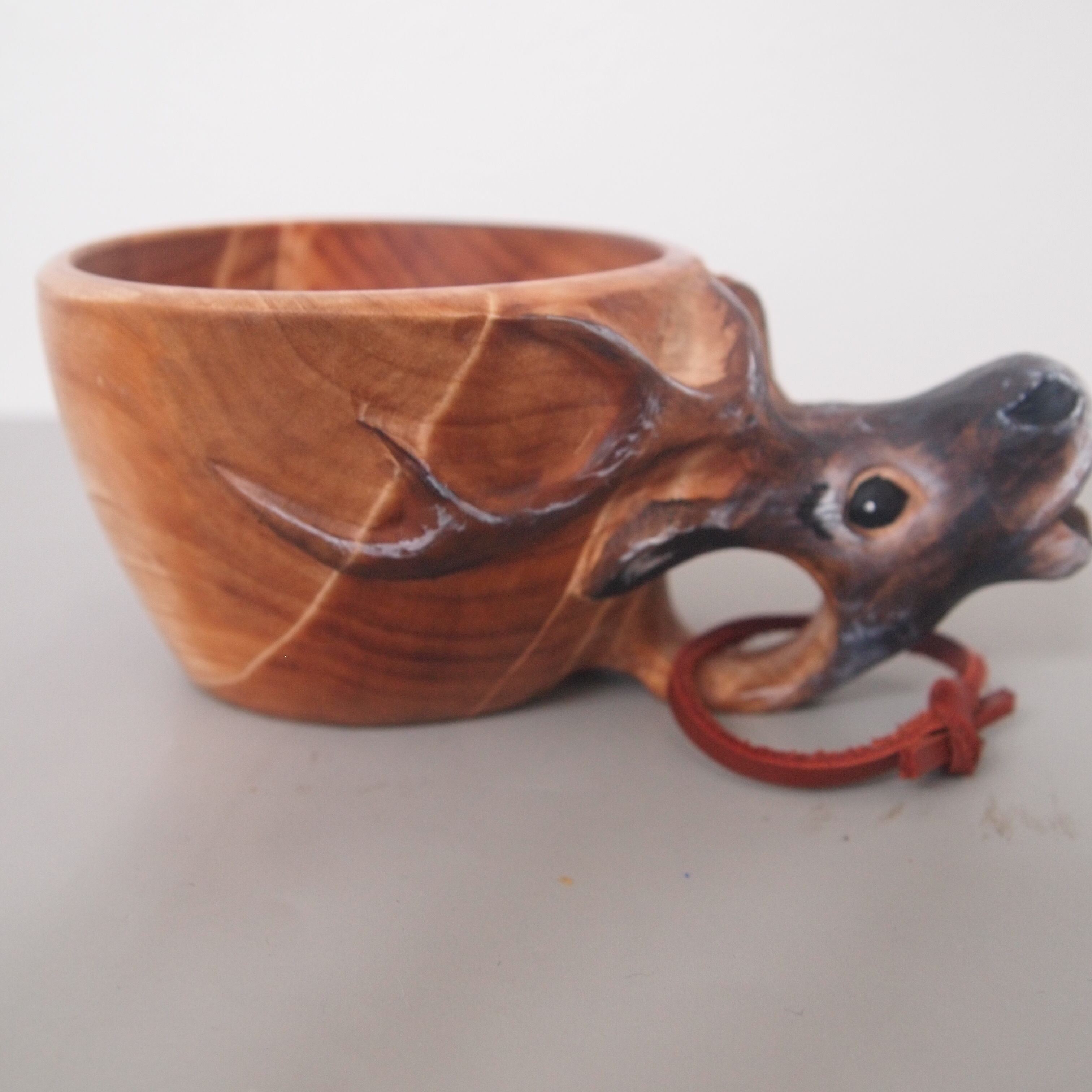 持ち手にトナカイの木彫りが施され、とても可愛らしいカップです。