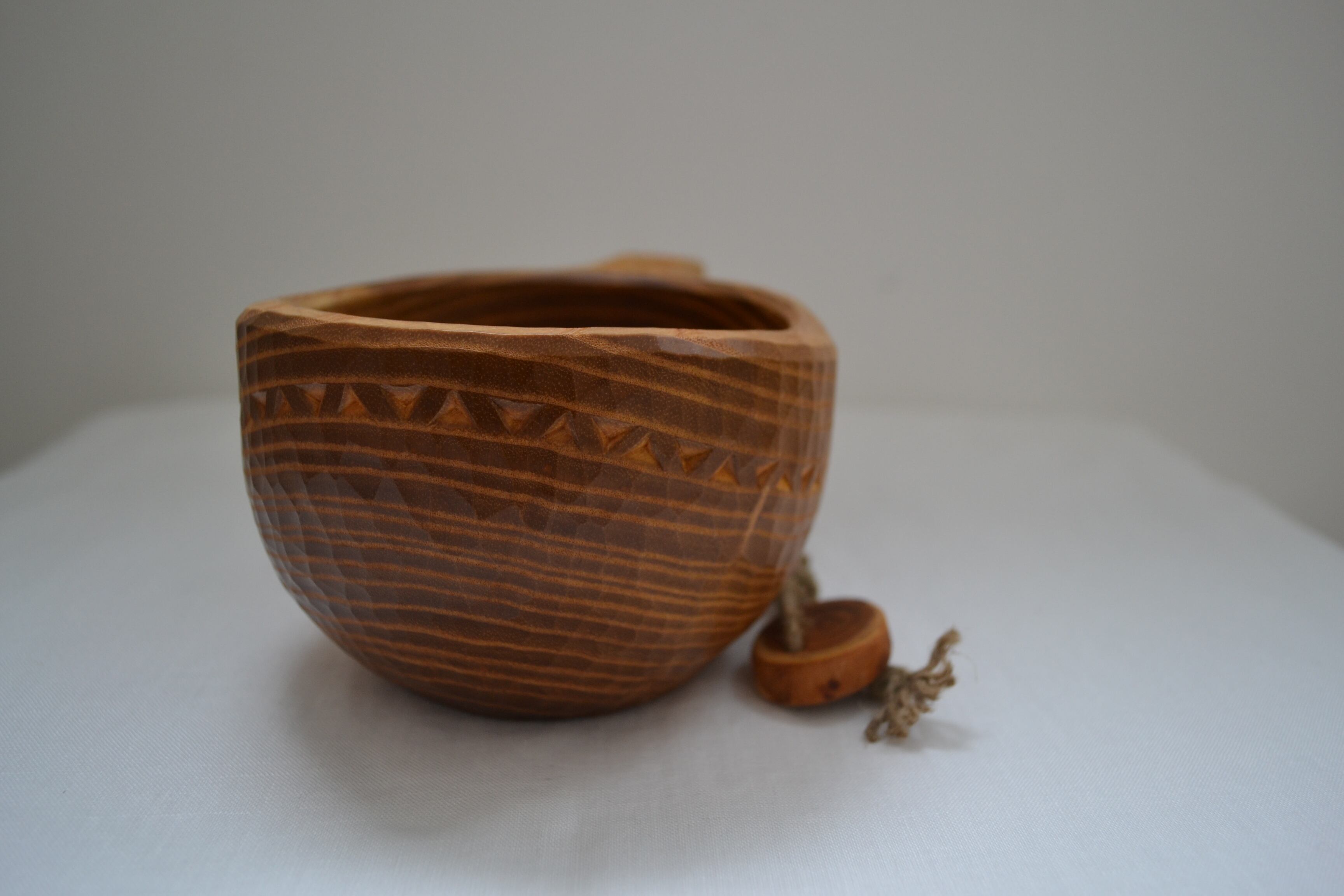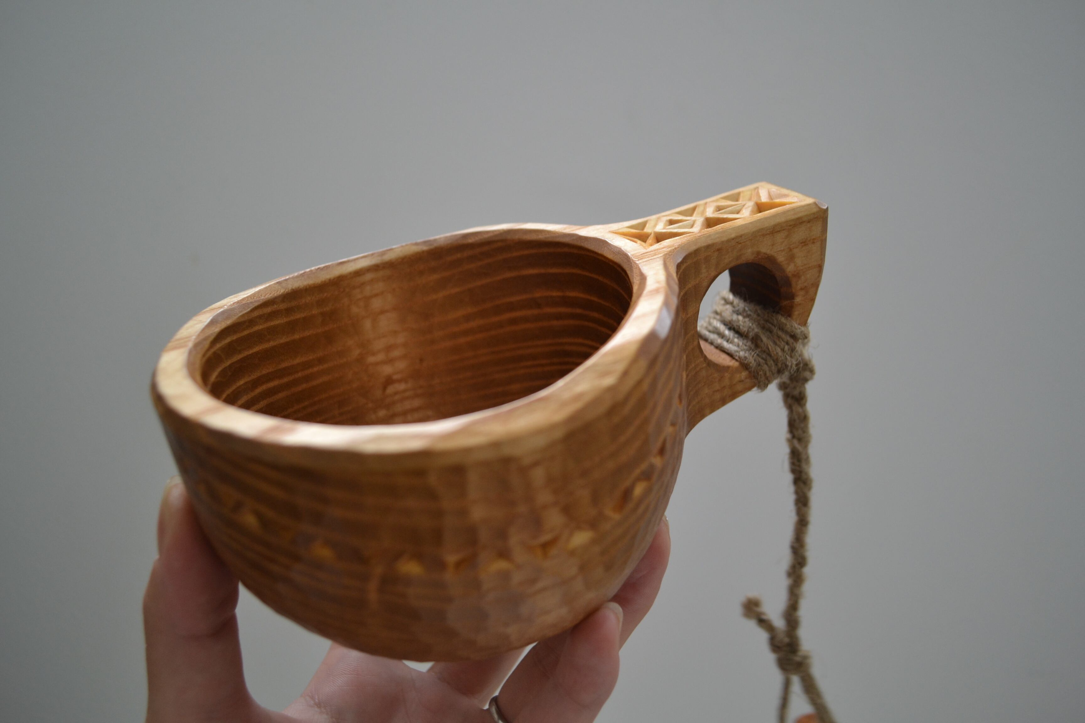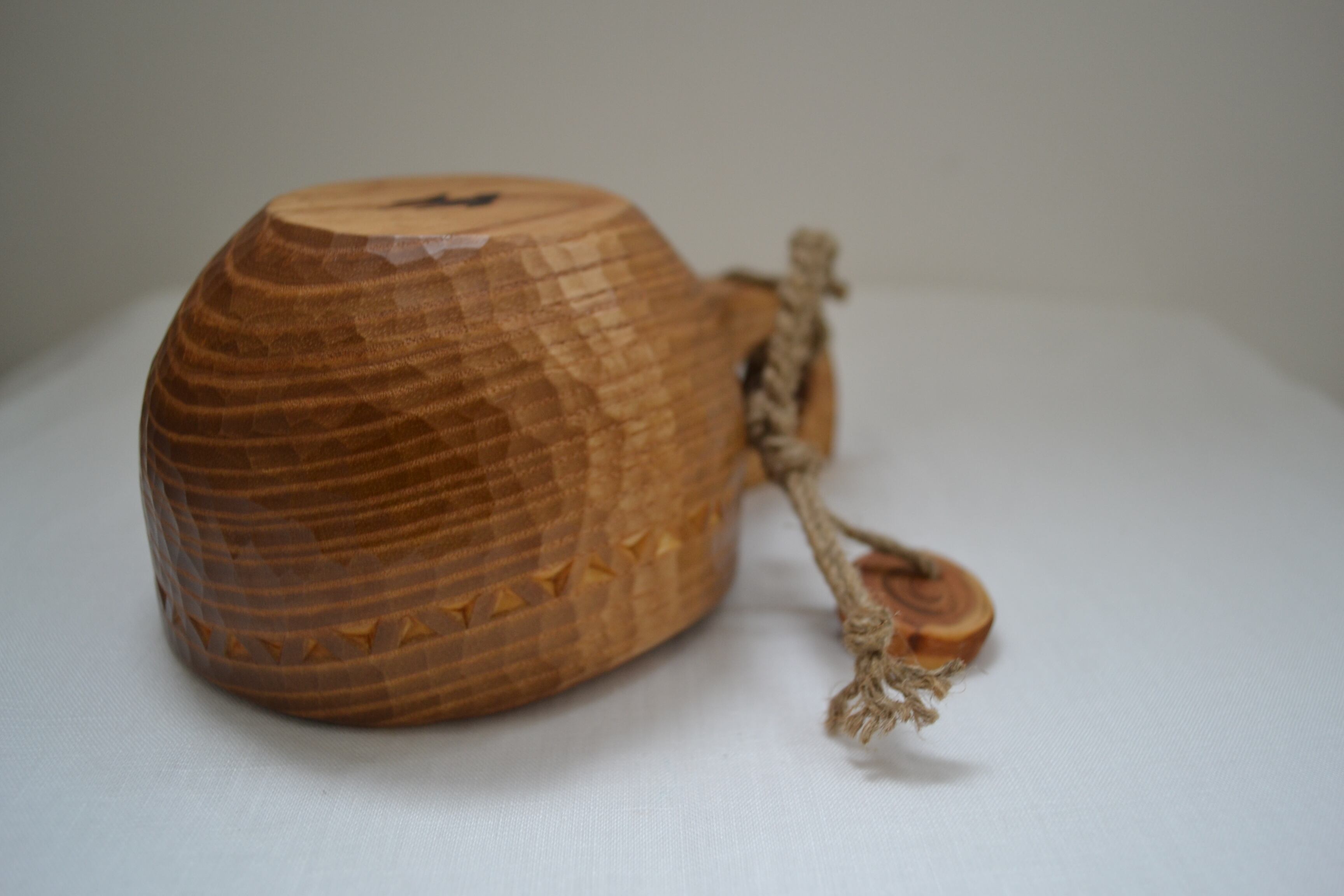 こちらはアッシュ材から作られており,とてもシンプルなデザインながら,杢目の美しい流れが際立って感じられる,店主好みのククサです♡持ち手と側面に可愛い彫り絵が施されております。容量320ccと意外と大きめです。一般的なマグカップの形をしているため,使いやすいかと思います。