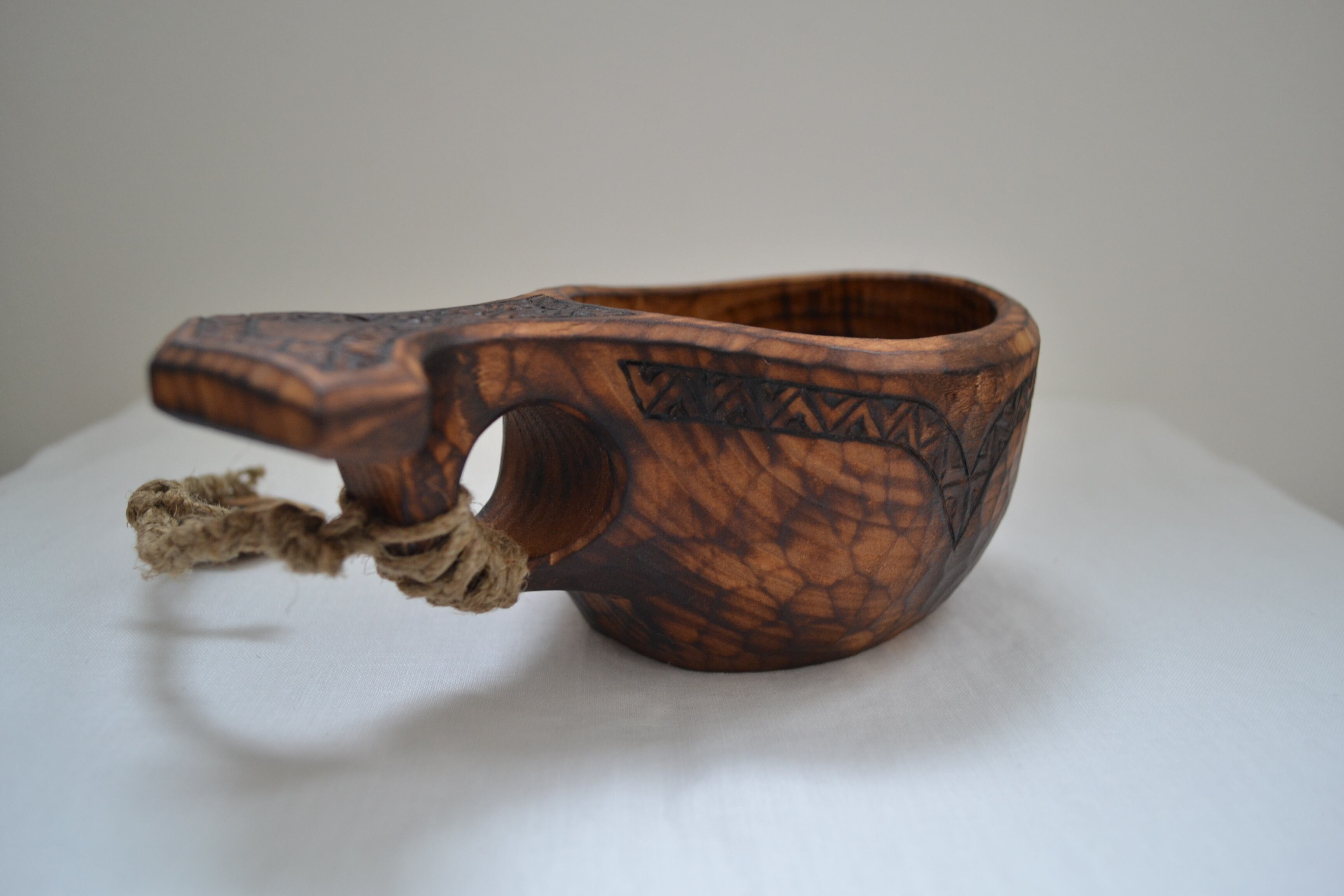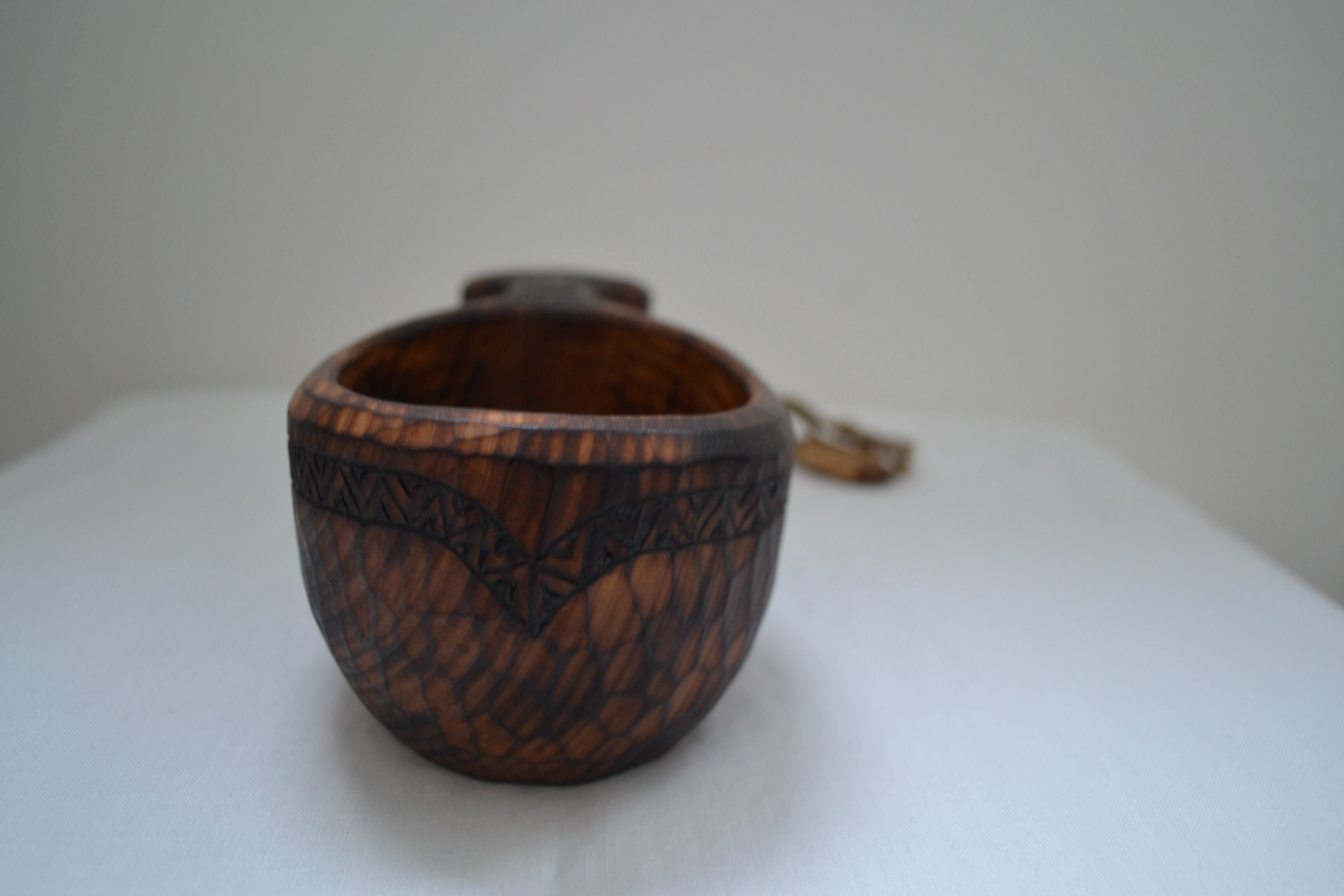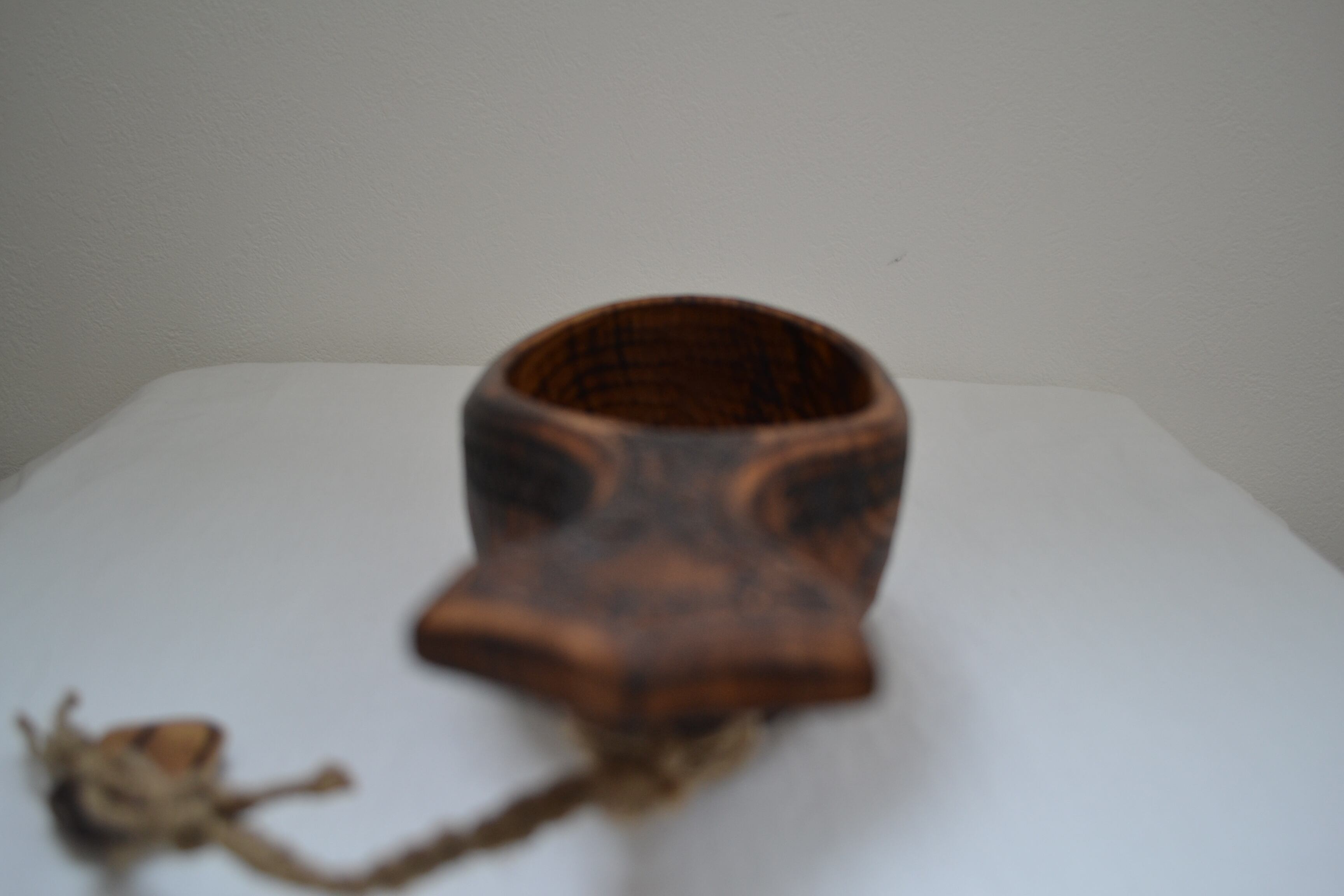 こちらはローマンさんの数多く制作されたククサの中でも,とても人気のあるカタチとデザインです。それに加え,バーナーで焼かれており,とてもワイルドに仕上がっております。カッコイイストラップもついています(^^)容量250ccで,使い勝手の良いサイズです。