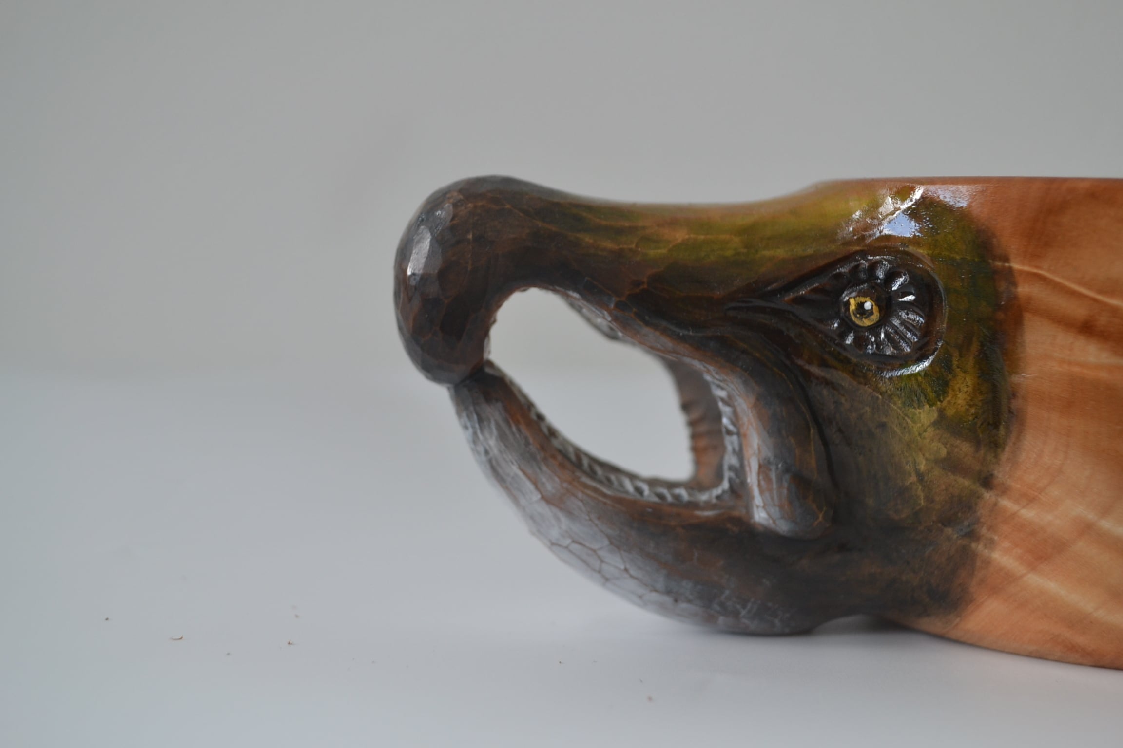 持ち手にサーモンの木彫りが施され、とてもリアルです。